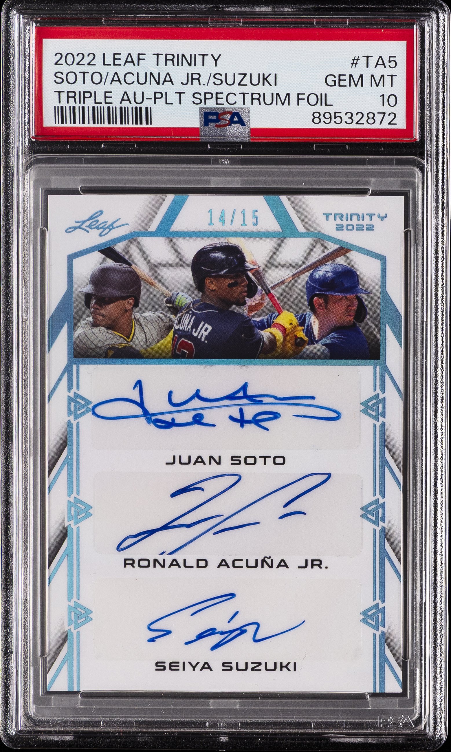 2022 LEAF TRINITY TRIPLE AUTOGRAPHS #TA5 SOTO/ACUNA JR./SUZUKI TRIPLE AU-PLT SPECTRUM FOIL 14/15 PSA 10