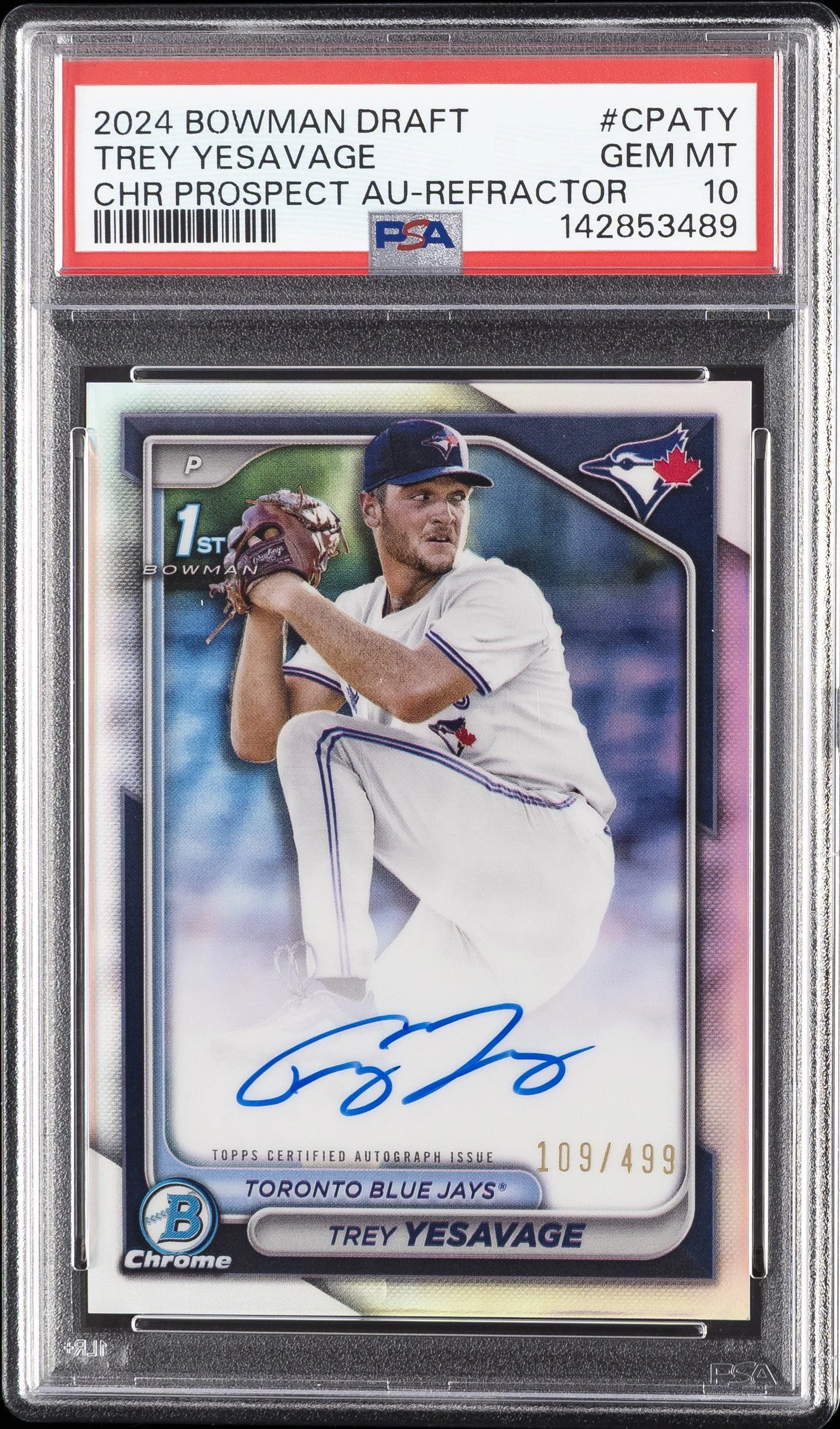 2024 BOWMAN DRAFT CHROME PROSPECT AUTOGRAPHS #CPATY TREY YESAVAGE CHR PROSPECT AU-REFRACTOR PSA 10