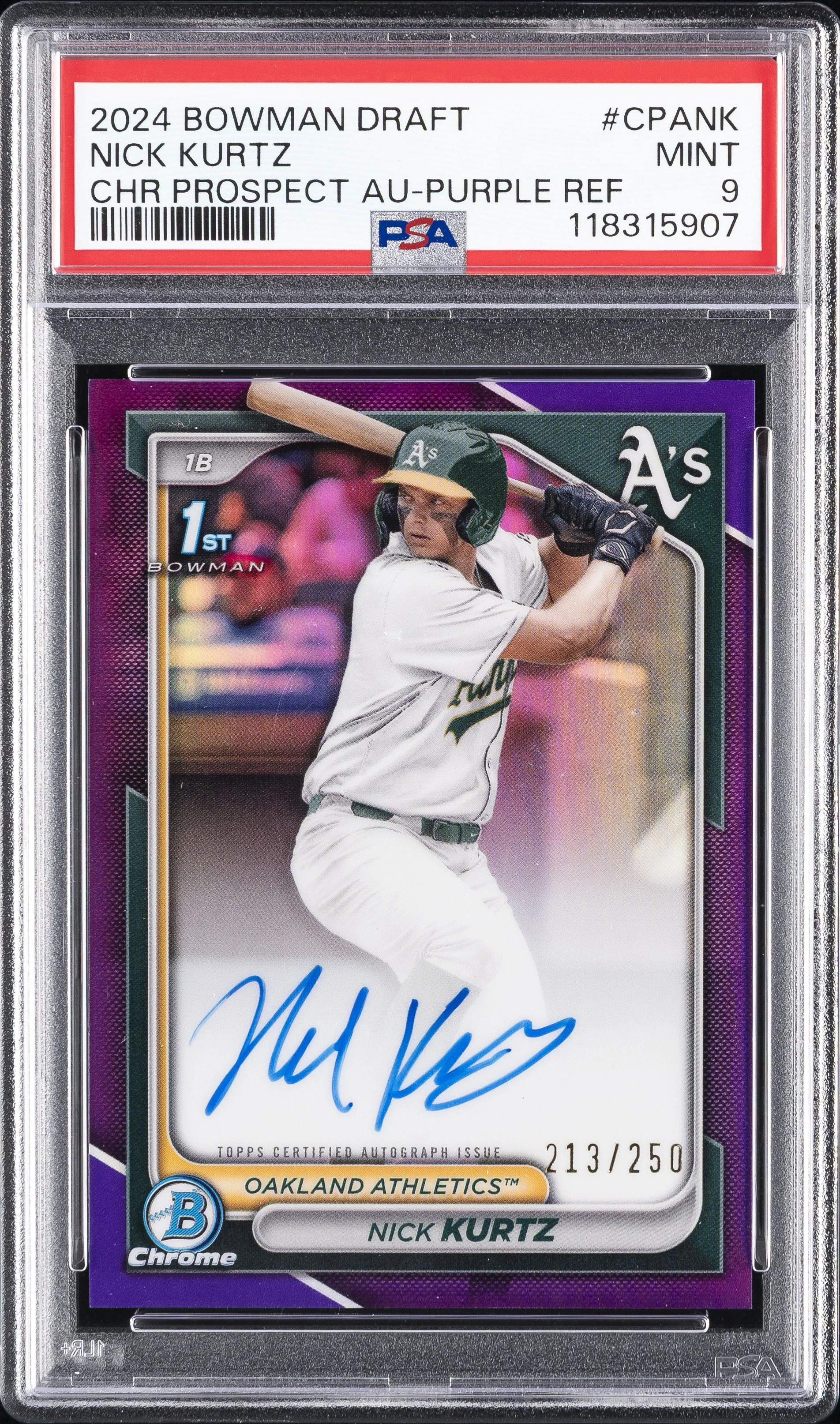 | Athletics | Nick Kurtz | 2024 BOWMAN CHROME NICK KURTZ 1ST PURPLE REFRACTOR AUTO /250 PSA 9 #CPANK |