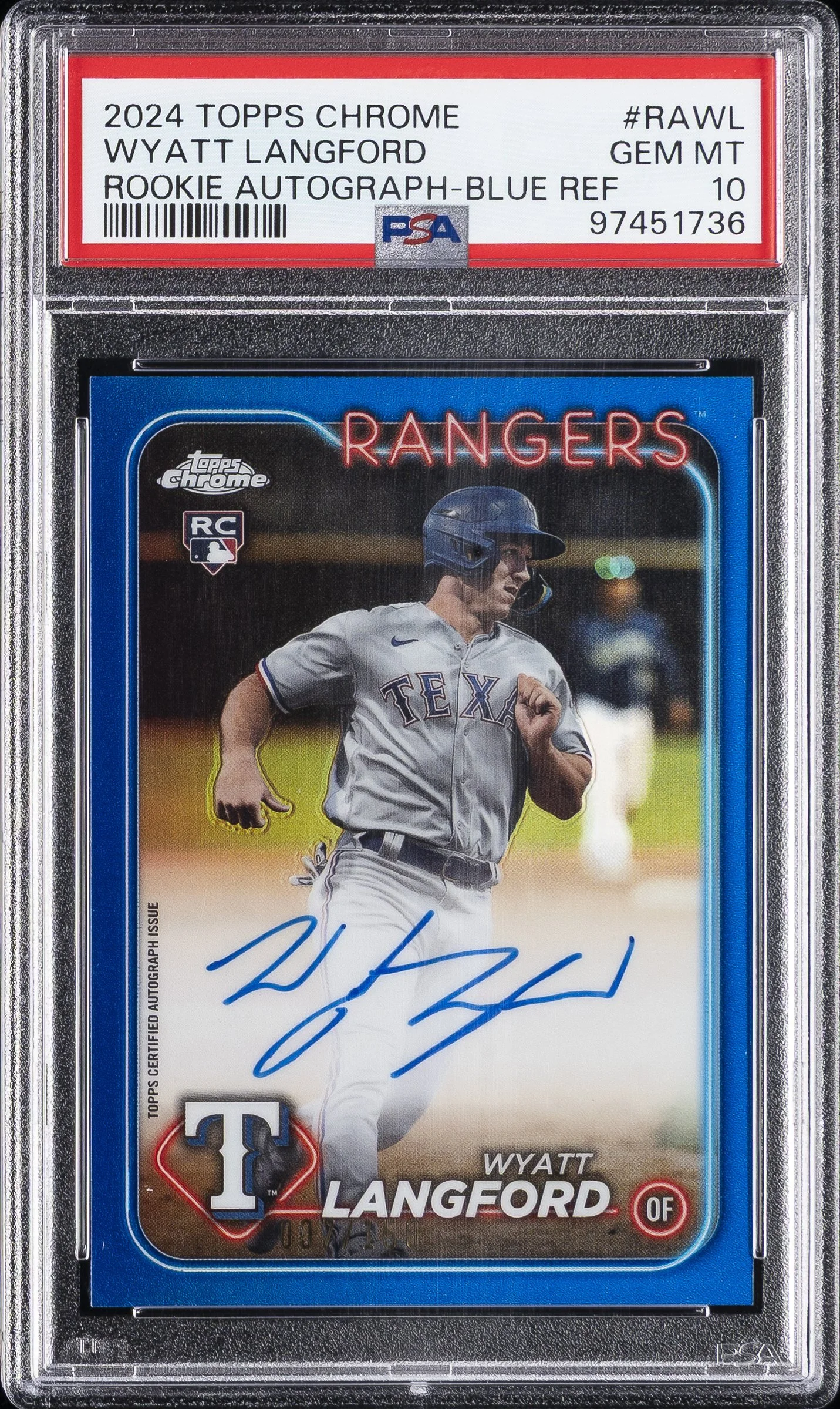| Rangers | Wyatt Langford | 2024 TOPPS CHROME ROOKIE AUTOGRAPHS #RAWL WYATT LANGFORD ROOKIE AUTOGRAPH-BLUE REF PSA 10 |