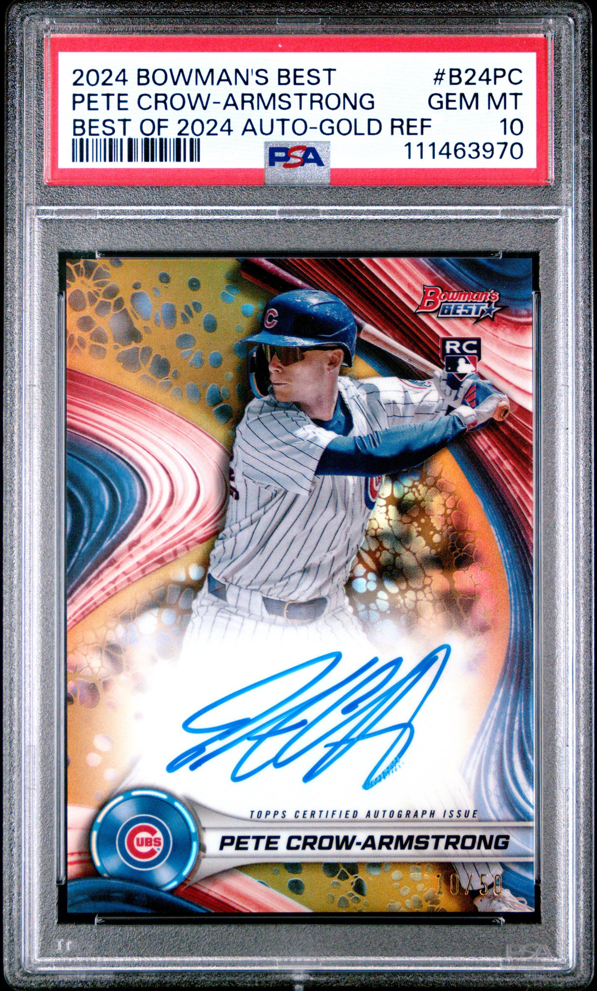 | Cubs | Pete Crow-Armstrong | 2024 BOWMAN'S BEST BEST OF 2024 AUTOGRAPHS #B24PC PETE CROW-ARMSTRONG BEST OF 2024 AUTO-GOLD REF PSA 10 |