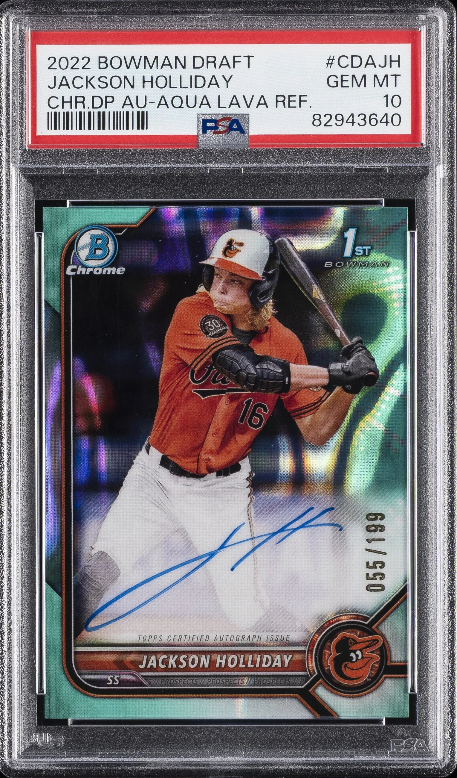 | Orioles | Jackson Holliday | 2022 BOWMAN DRAFT CHROME DRAFT PICK AUTOGRAPHS #CDAJH JACKSON HOLLIDAY CHR.DP AU-AQUA LAVA REF. PSA 10 |