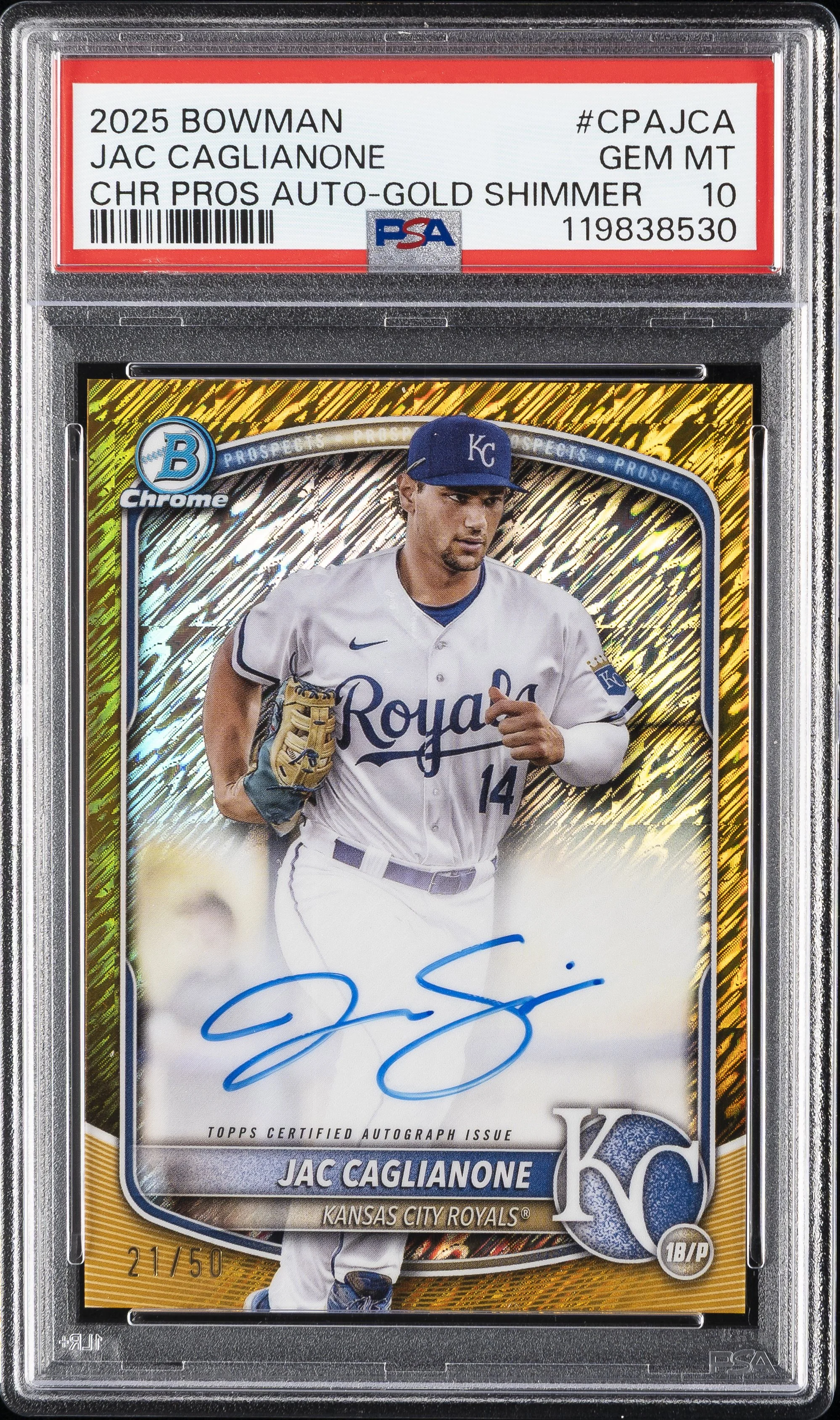 | Royals | Jac Cagilanone | 2025 BOWMAN CHROME PROSPECT AUTOGRAPHS #CPAJCA JAC CAGLIANONE CHR PROS AUTO-GOLD SHIMMER PSA 10 |