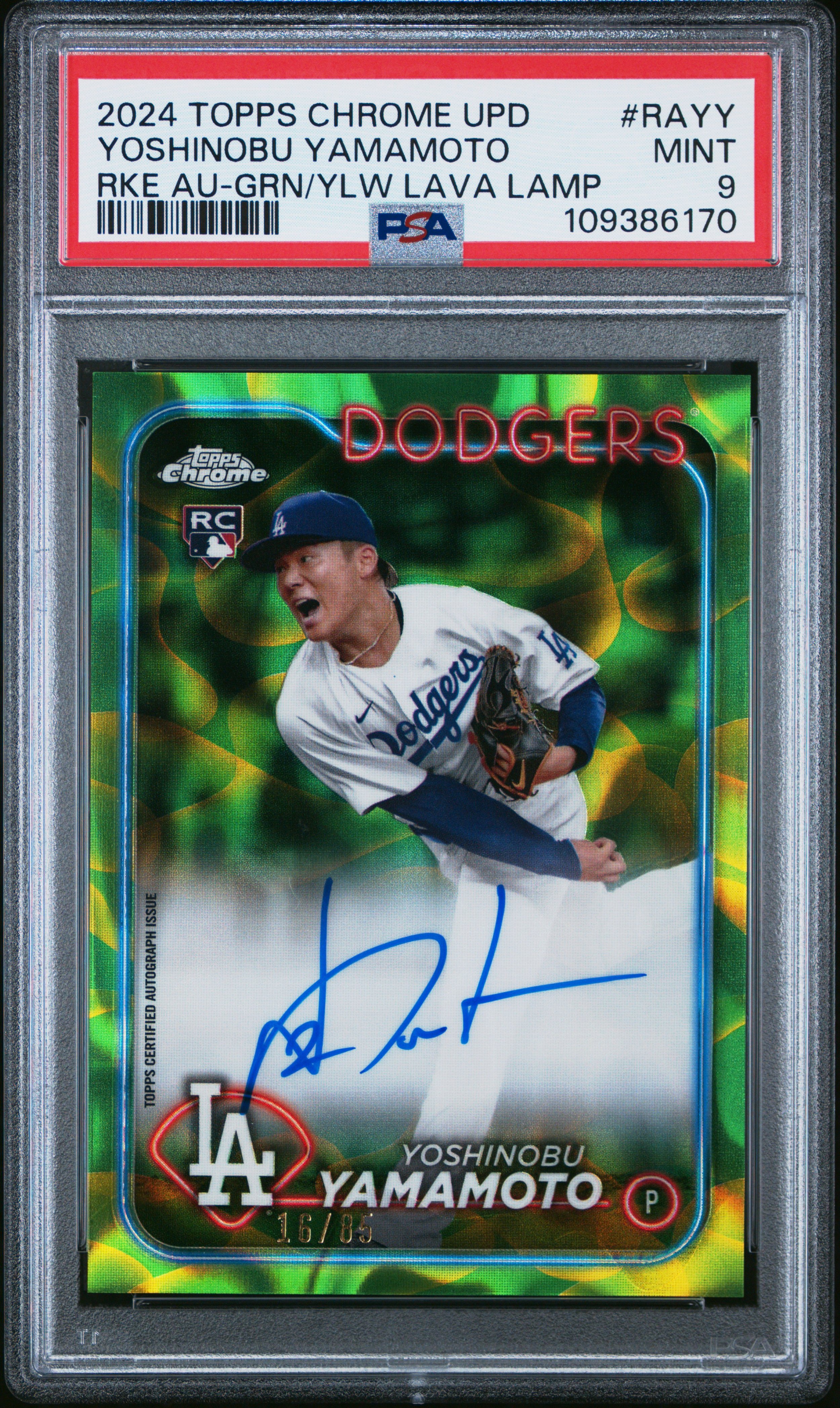 | Dodgers | Yoshinobu Yamamoto | 2024 TOPPS CHROME YOSHINOBU YAMAMOTO GREEN/YELLOW/LAVA LAMP AUTO /85 PSA 9 #RAYY |