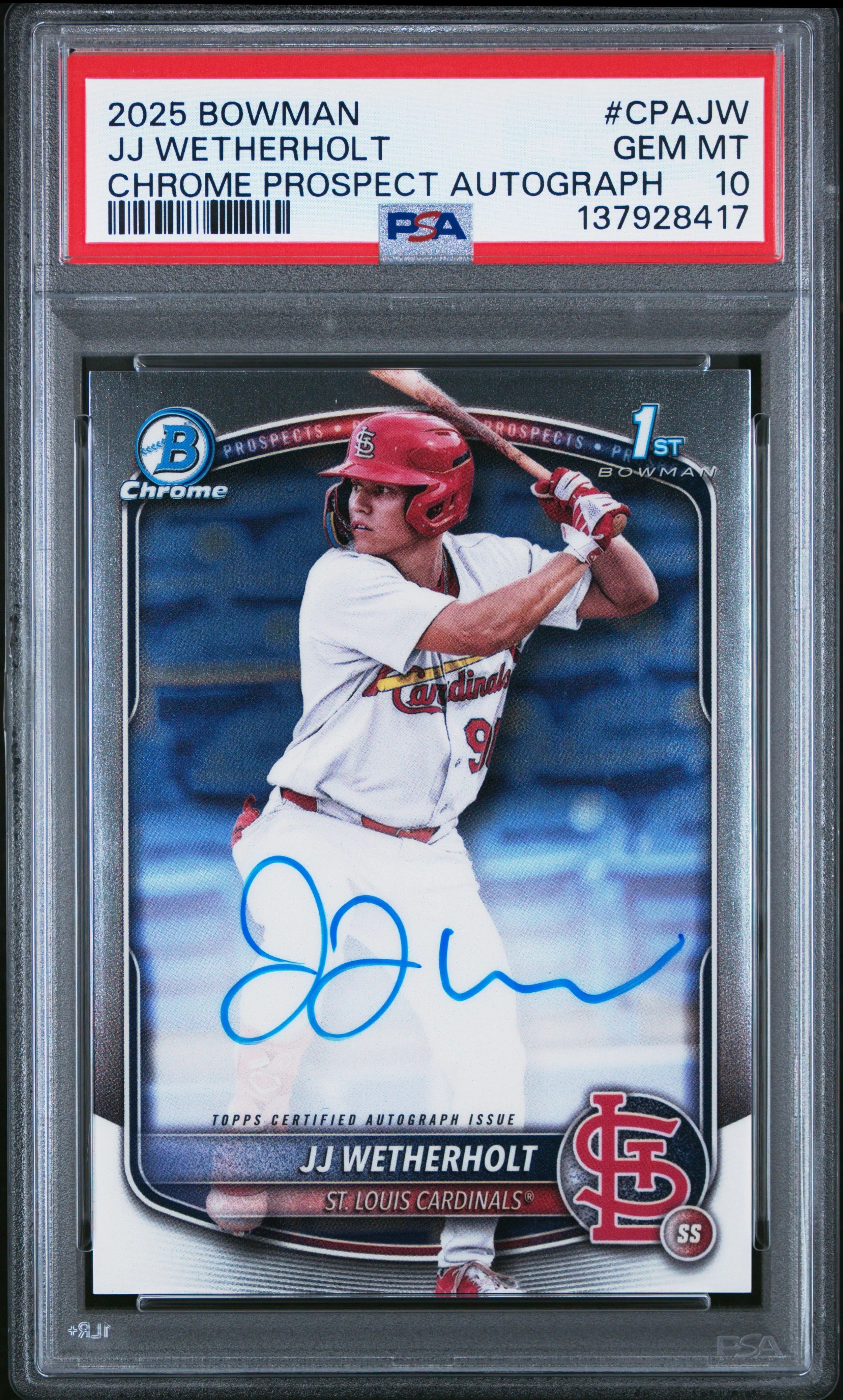 | Cardinals | JJ Wetherholt | 2025 BOWMAN CHROME PROSPECT AUTOGRAPHS #CPAJW JJ WETHERHOLT PSA 10 |