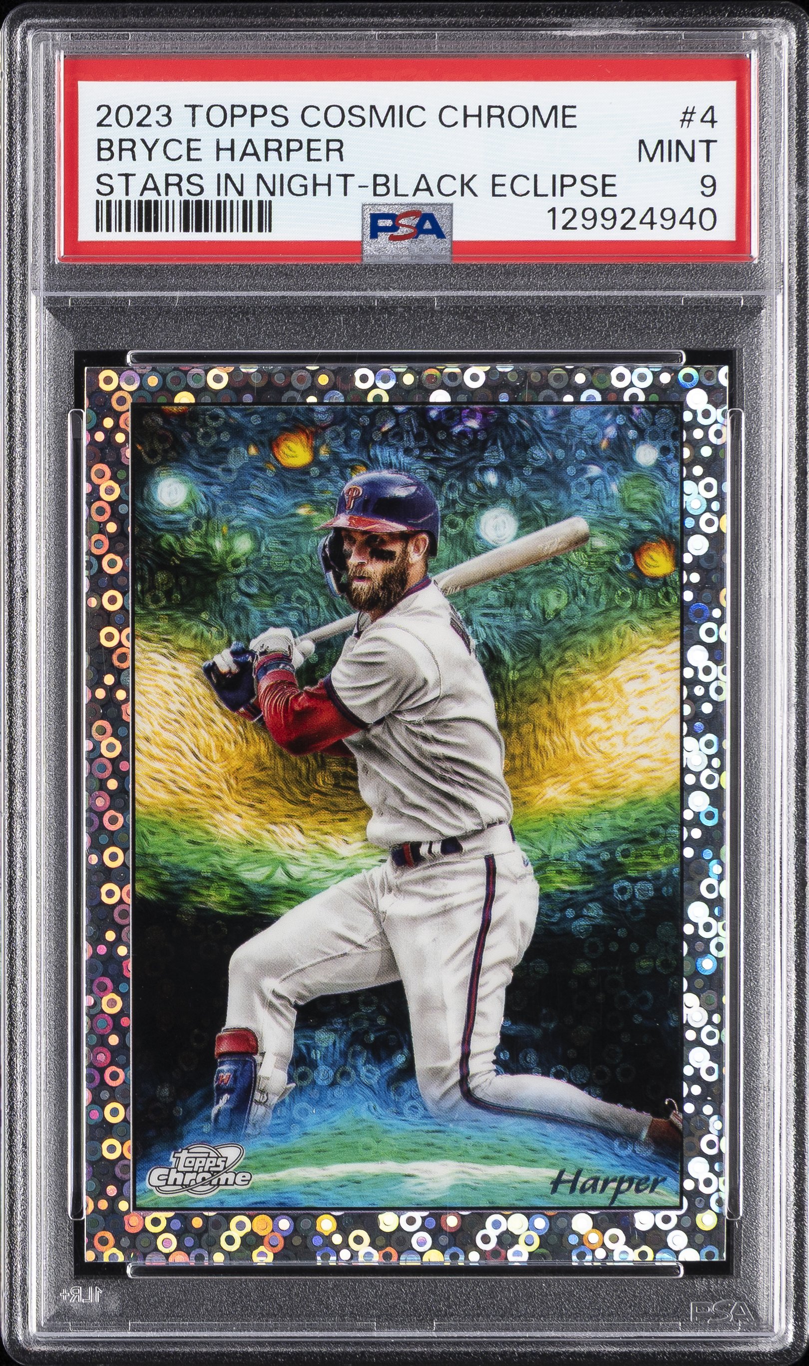 | Phillies | Bryce Harper | 2023 TOPPS COSMIC CHROME STARS IN THE NIGHT #4 BRYCE HARPER STARS IN NIGHT-BLACK ECLIPSE PSA 9 |
