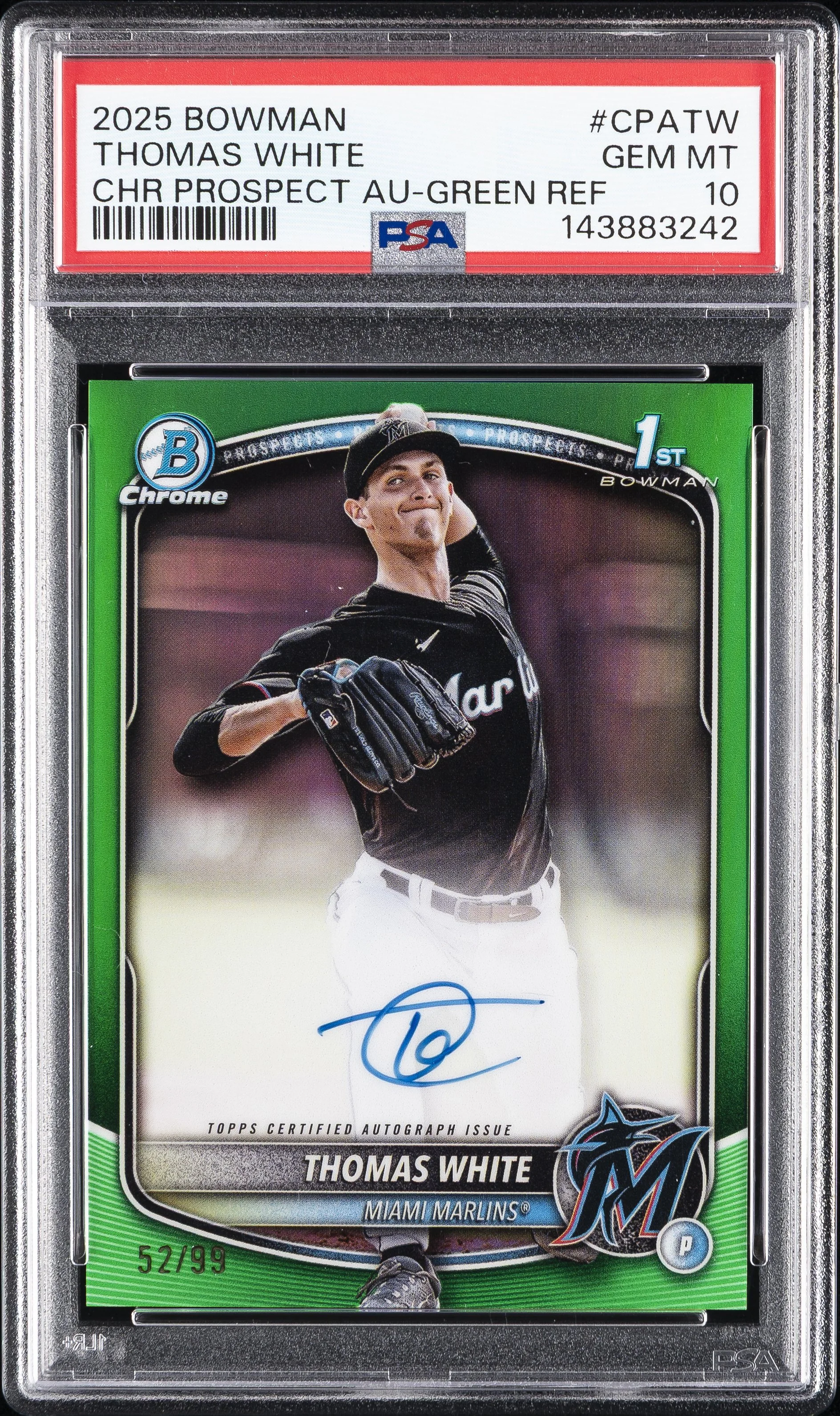 | Marlins | Thomas White | 2025 BOWMAN CHROME PROSPECT AUTOGRAPHS #CPATW THOMAS WHITE CHR PROSPECT AU-GREEN REF PSA 10 |