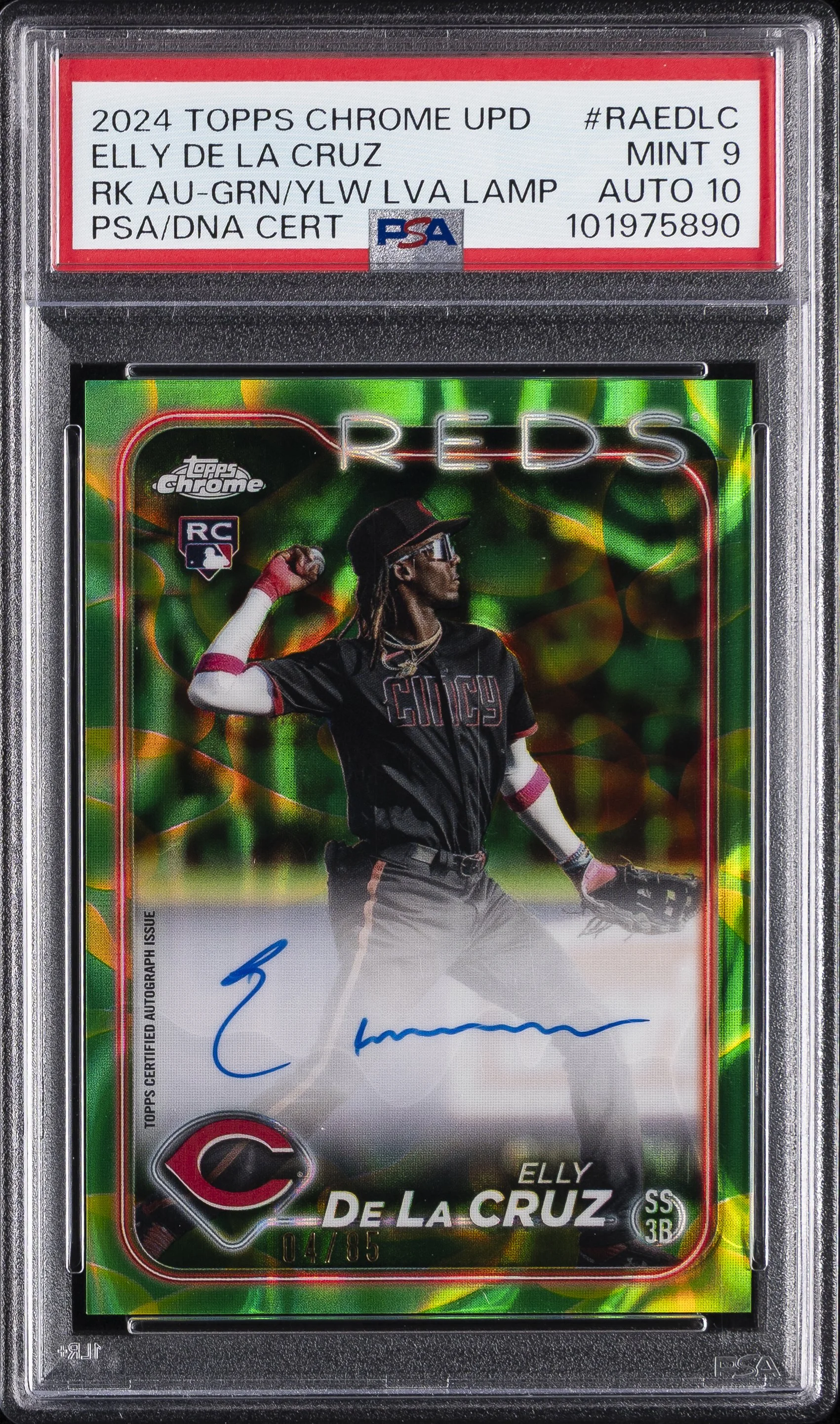 | Reds | Elly De La Cruz | 2024 TOPPS CHROME UPDATE CHROME ROOKIE AUTOGRAPHS #RAEDLC ELLY DE LA CRUZ RK AU-GRN/YLW LVA LAMP PSA 9 AUTO 10 |