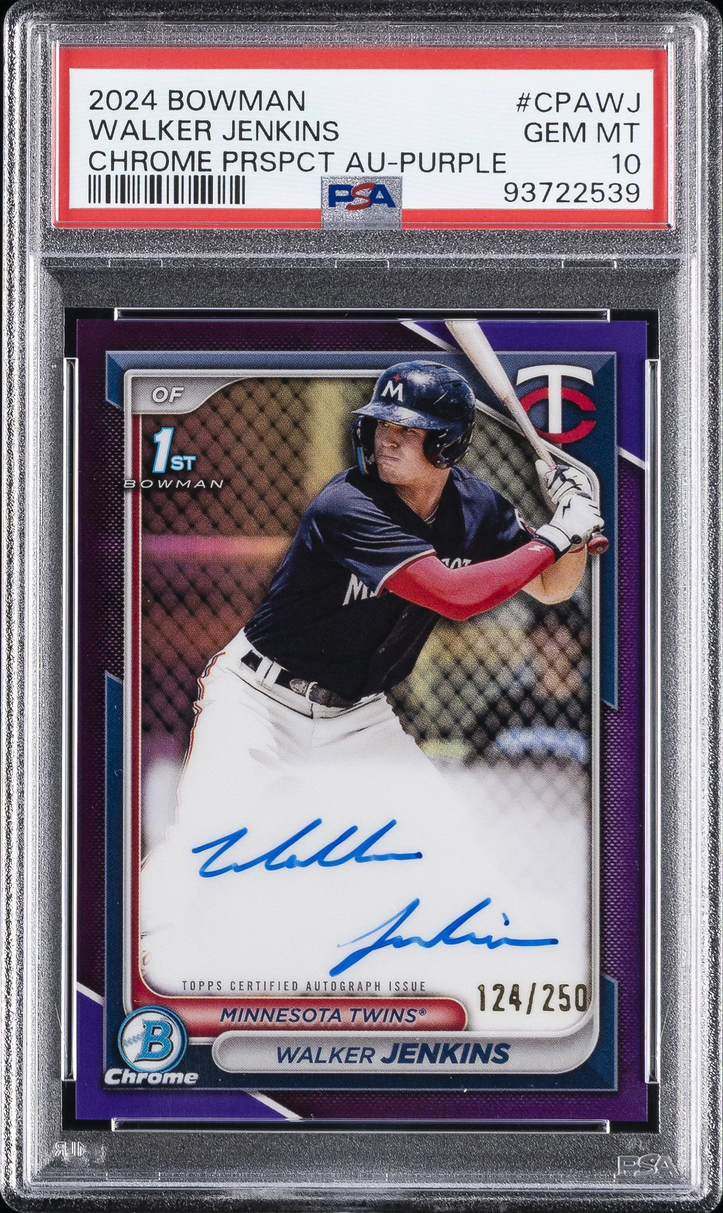 | Twins | Walker Jenkins | 2024 BOWMAN CHROME WALKER JENKINS PURPLE REFRACTOR AUTO /250 PSA 10 #CPAWJ |