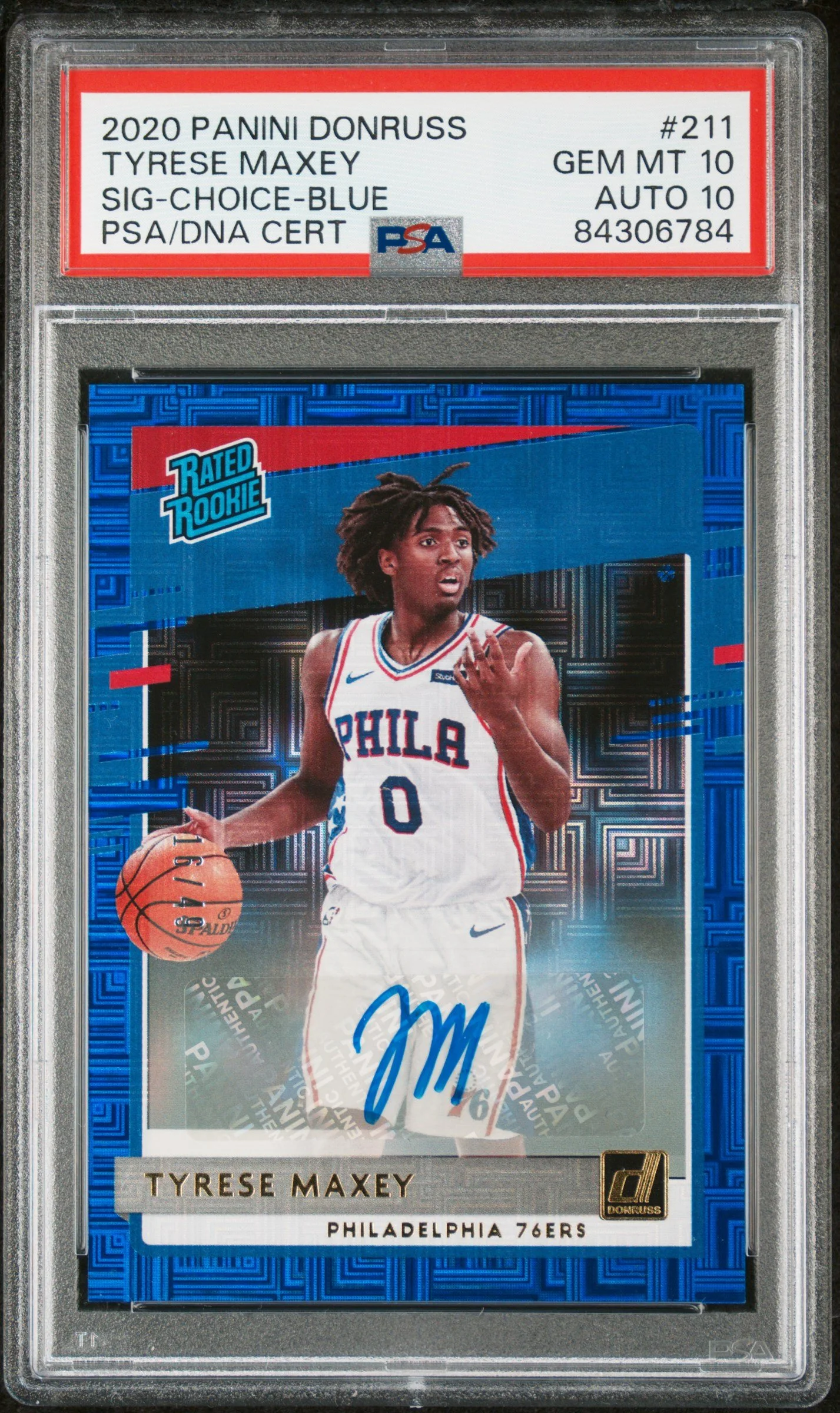 2020 PANINI DONRUSS #211 TYRESE MAXEY SIG-CHOICE-BLUE PSA 10 AUTO 10