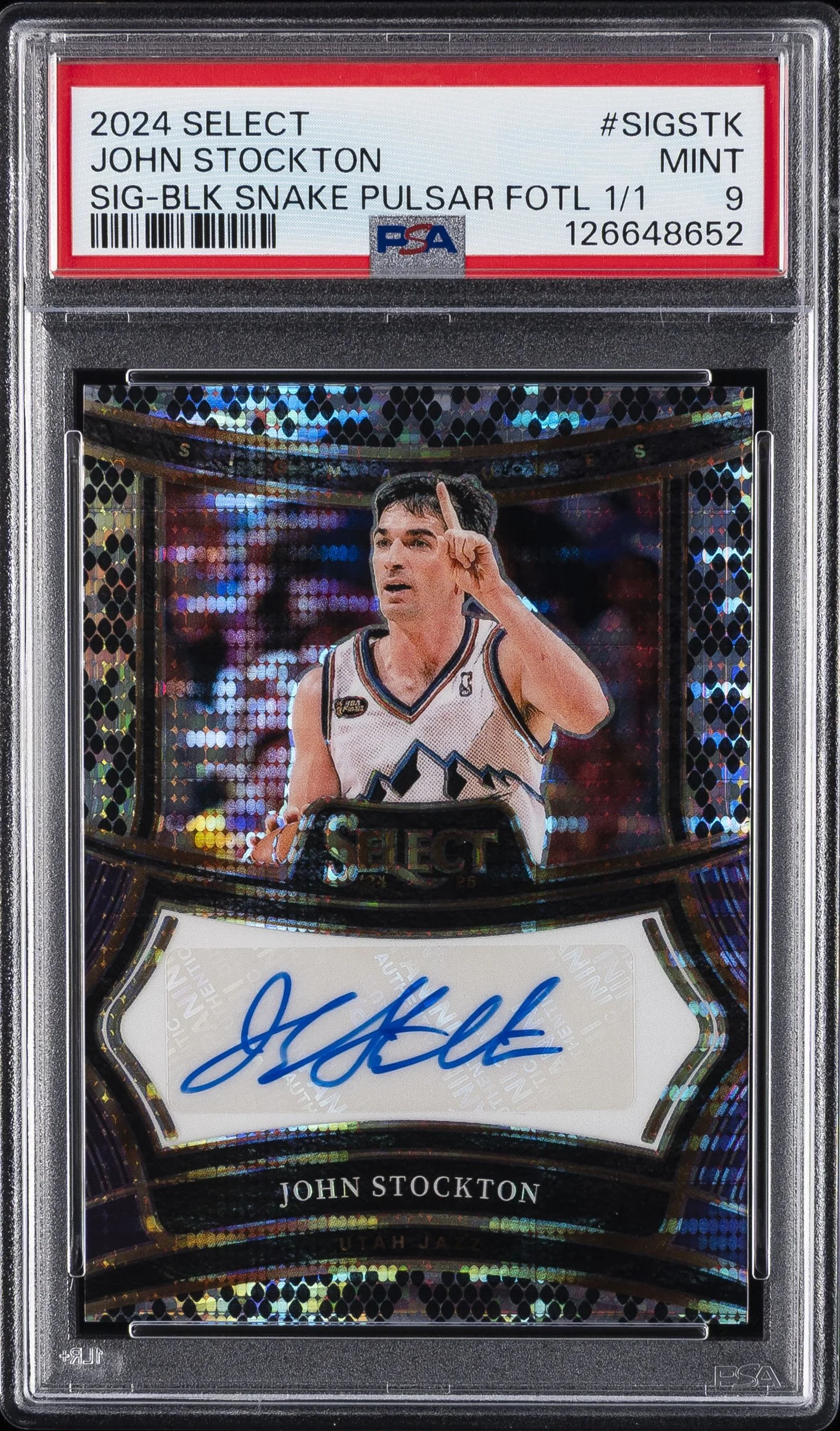 2024 PANINI SELECT SIGNATURES #SIGSTK JOHN STOCKTON SIG-BLK SNAKE PULSAR FOTL 1/1 PSA 9
