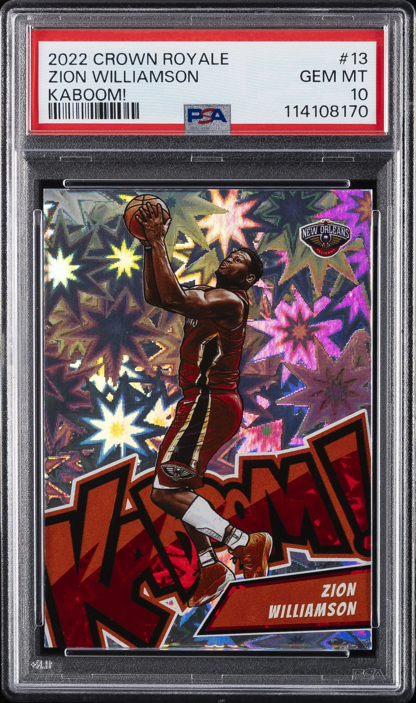 | Pelicans | Zion Willamson | 2022 PANINI CROWN ROYALE KABOOM ZION WILLAMSON PSA 10 #13 |