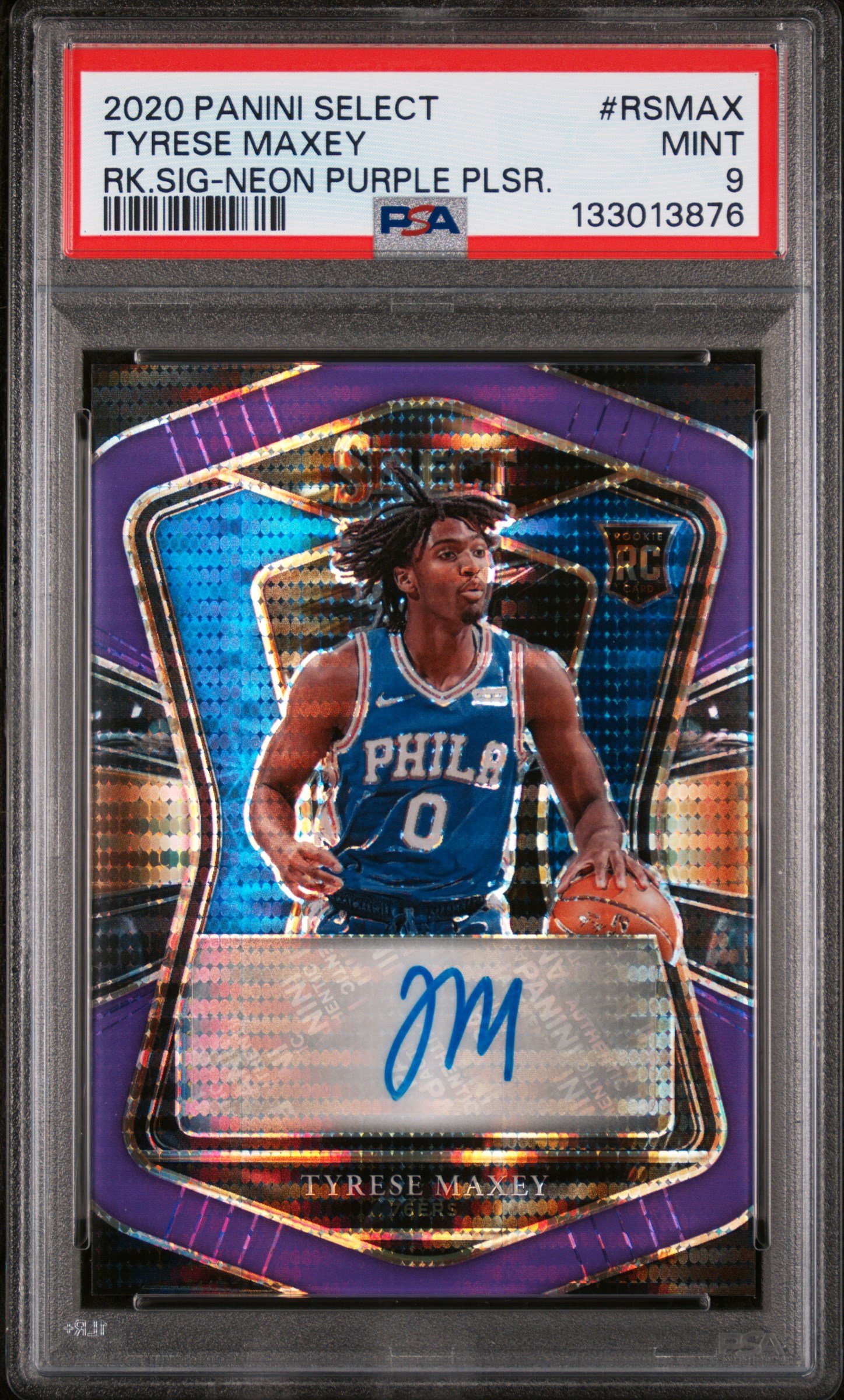 | 76ers | Tyrese Maxey | 2020 PANINI SELECT ROOKIE SIGNATURES #RSMAX TYRESE MAXEY RK.SIG-NEON PURPLE PLSR. PSA 9 |