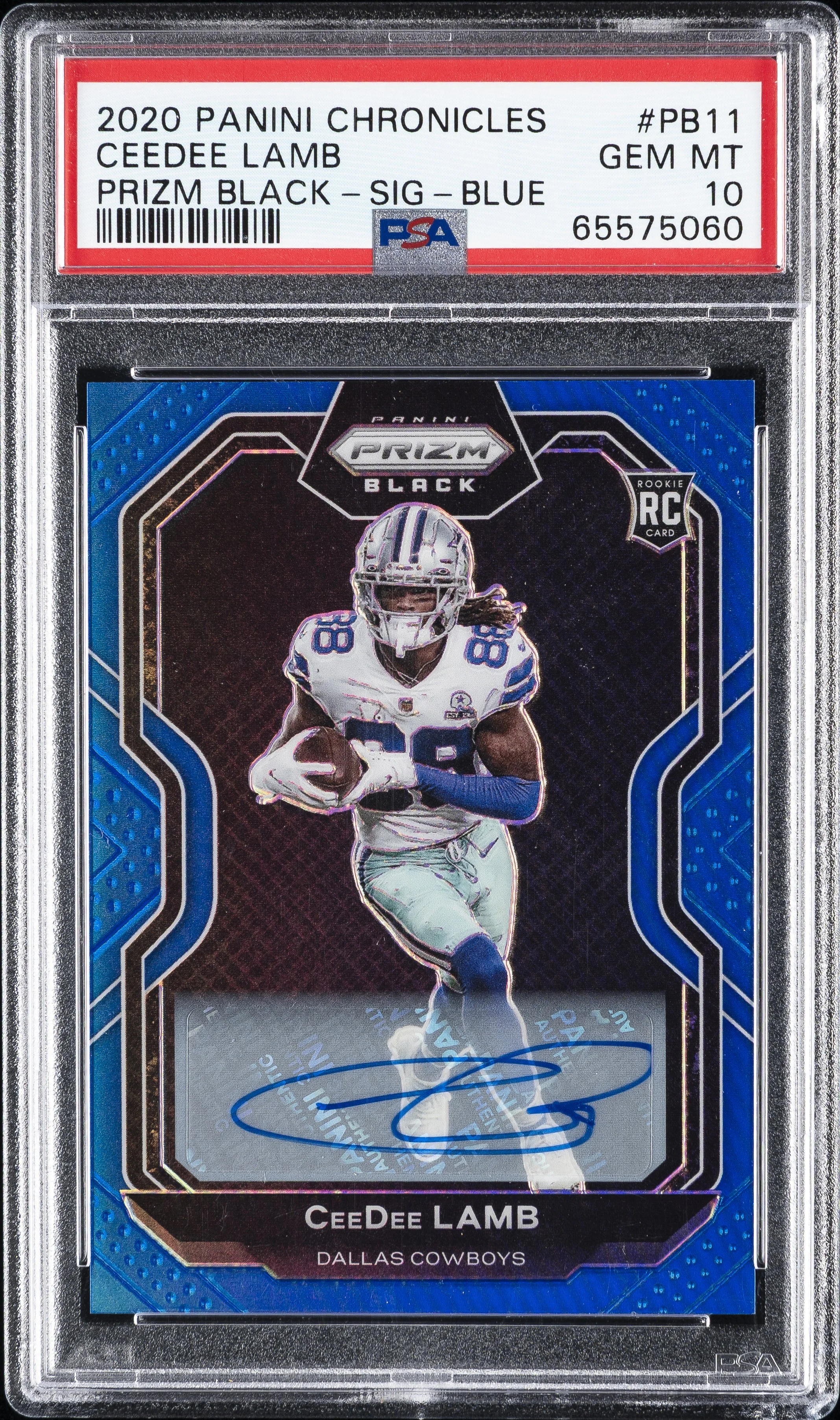 2020 PANINI CHRONICLES PRIZM BLACK #PB11 CEEDEE LAMB PRIZM BLACK-SIG-BLUE PSA 10
