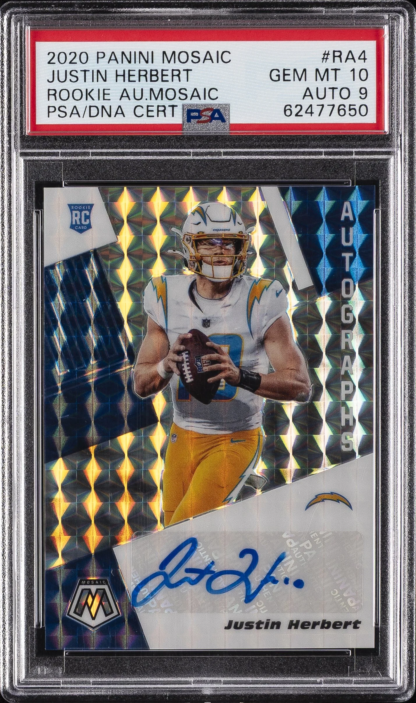 2020 PANINI MOSAIC RC AUTOS MOSAIC #RA4 JUSTIN HERBERT ROOKIE RC PSA 10 AUTO 9